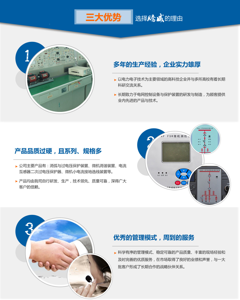 合肥騰威集成電子技術(shù)有限公司是一家以電力電子技術(shù)為主要領(lǐng)域的高科技企業(yè),坐落于國家科技創(chuàng)新型城市合肥,與多所高校有著長期科研交流關(guān)系。 公司長期致力于電網(wǎng)控制設(shè)備與保護(hù)裝置的研發(fā)與制造,為顧客提供業(yè)內(nèi)先進(jìn)的產(chǎn)品與技術(shù)。公司主要產(chǎn)品有:消弧與過電壓保護(hù)裝置、微機(jī)消諧裝置、電流互感器二次過電壓保護(hù)器、微機(jī)小電流接地選線裝置、微機(jī)電壓綜合保護(hù)裝置(抑制柜/聚優(yōu)柜控制器)、開關(guān)柜智能操控裝置、開關(guān)柜無線測溫裝置、電網(wǎng)運(yùn)行設(shè)備在線絕緣監(jiān)測裝置、可恢復(fù)式爆炸橋控制器、中性點(diǎn)接地電阻柜微機(jī)測控裝置等。以上產(chǎn)品均由我司自行研發(fā)、生產(chǎn),質(zhì)量可靠,深得廣大客戶的信賴。 公司憑借科學(xué)有序的管理模式、穩(wěn)定可靠的產(chǎn)品質(zhì)量、豐富的現(xiàn)場經(jīng)驗(yàn)和及時(shí)完善的服務(wù),在市場取得了良好的業(yè)績和聲譽(yù),與一大批客戶形成了長期合作的戰(zhàn)略伙...更多>